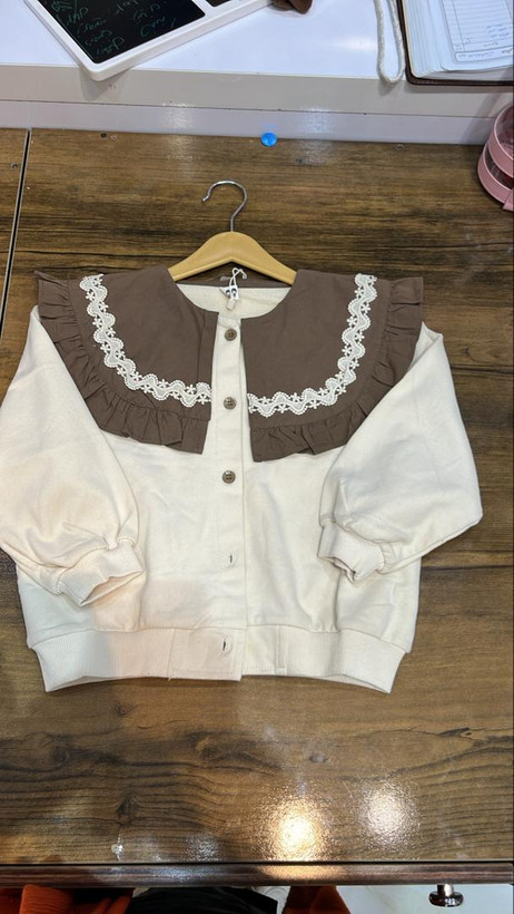 بلوز جلو باز دخترانه یقه مدل دار وارداتی موجود در دو رنگ کرم و شکلاتی مناسب برای سنین ۵ تا ۸ سال